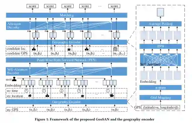 摘要:序列位置推荐在移动性预测、路径规划、基于位置广告等应用中发挥着重要作用。虽然从张量分解发展到基于RNN的神经网络,但现有方法没有有效利用地理信息,存在稀疏性问题。为此,我们提出了一种基于自注意力网络的地理感知序列推荐器(GeoSAN)进行位置推荐。一方面,我们提出了一种新的基于重要性抽样的损失函数进行优化,通过强调使用信息丰富的负样本来解决稀疏性问题。另一方面,为了更好地利用地理信息,GeoSAN使用基于自注意力的地理编码器来表示每个GPS点的分层网格。此外,我们还提出了地理感知的负采样器来提高负样本的信息量。我们使用三个真实的LBSN数据集对所提出的算法进行了评估,结果表明GeoSAN的性能比最新的序列位置推荐器高出34.9%。实验结果进一步验证了新的损失函数、地理编码器和地理感知负采样器的有效性。