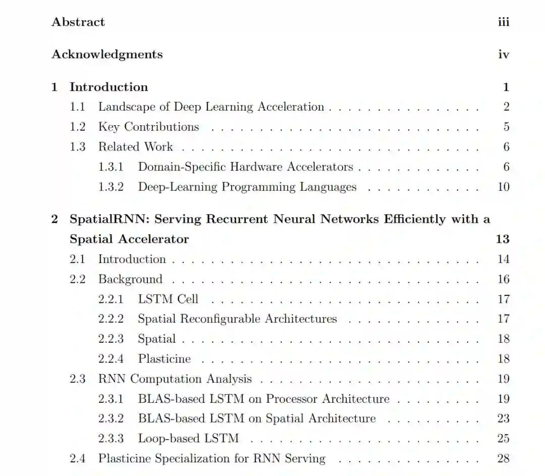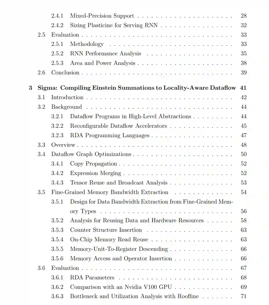 许多人认为,处理系统需要更多的计算资源来更好地促进这些模型的发展。然而,在实践中,大多数深度学习应用程序都受到内存带宽的限制,而不是计算能力。深度学习模型使用数据流图表示,其中一个节点表示一个张量或一个算子,一条边表示节点之间的数据流。由于大张量操作,边之间的数据流可能超过千兆字节。在现代处理系统中,这些数据的移动通常要比实际计算的时间长得多。因此,针对深度学习模型的优化技术必须专注于有效地管理数据流。然后,我总结了本论文每一章的重点。最后,讨论了前人的研究项目与本文的关系。