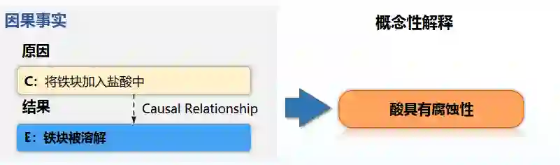 例如将铁块加入盐酸中,导致铁块被溶解。需要生成概念性的解释酸具有腐蚀性,显然这不只是因果对的解释。