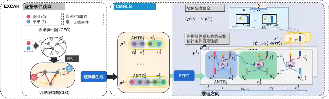 具体而言是使用条件马尔可夫神经逻辑网络(CMNLN),其中逻辑网络具有较强的可解释性与可靠性。神经逻辑网络是指利用神经网络表示规则,并赋予每个因果规则以权重(因果强度),以应对规则集合中可能存在的噪音与统计关系的复杂性。条件马尔可夫还能支持因果叠加效应,即对于同一规则,不同的前件可能对因果强度带来不同的影响。基本逻辑是:证据事件→逻辑规则→因果逻辑图。