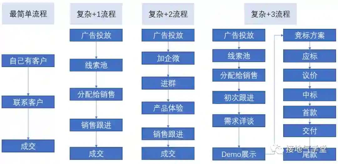不同销售流程的操作不一样,想让指标体系具体、能落地,就得深入业务细节之中,看具体是怎么操作的。有的流程可能很简单,比如销售自带客户资源,那就自己联系客户→签约,结束。