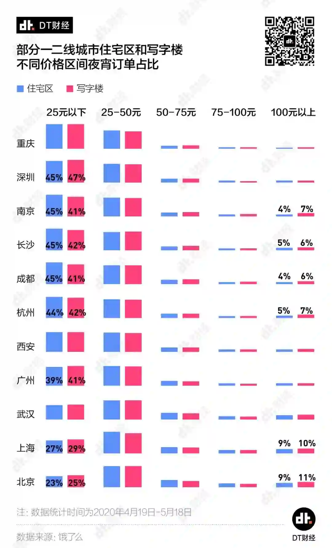 在成都、杭州、南京和长沙四个城市,相对于住宅区的人们,写字楼的加班党们更愿意点一份价格更高的夜宵安慰自己。