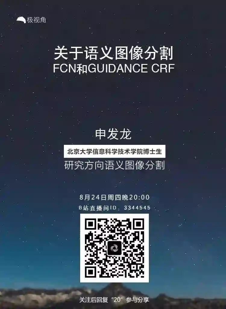 长按下图,识别图中二维码,关注“极市平台”公众号,回复20即可获取直播链接。如有想参加极视角群内分享的,欢迎回复“加群”获取加群信息。