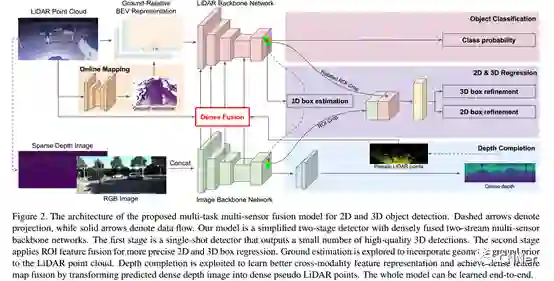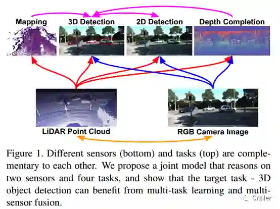 在本文中,我们提出利用多个相关任务来实现精确的多传感器3D目标检测。为了实现这一目标,我们提出了一种端到端可学习的架构,用于2D和3D目标检测以及地面估计和深度完成。实验表明,所有这些任务都是互补的,并通过融合不同层次的信息,帮助网络学习更好的表征。更重要的是,本文方法领先于KITTI基准的2D, 3D和鸟瞰目标检测,同时是实时的。