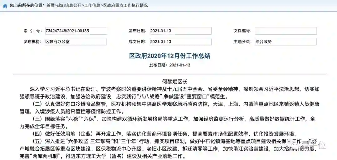 宁波市镇海区人民政府发布的《区政府2020年12月份工作总结》提到: