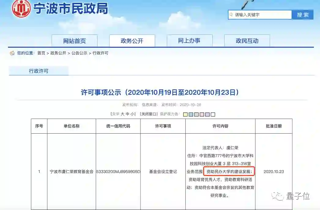 2020年10月26日宁波市民政局公示的许可事项,也佐证了虞仁荣资助民办大学建设发展一事。