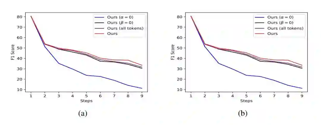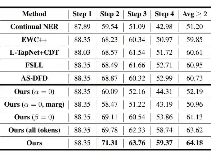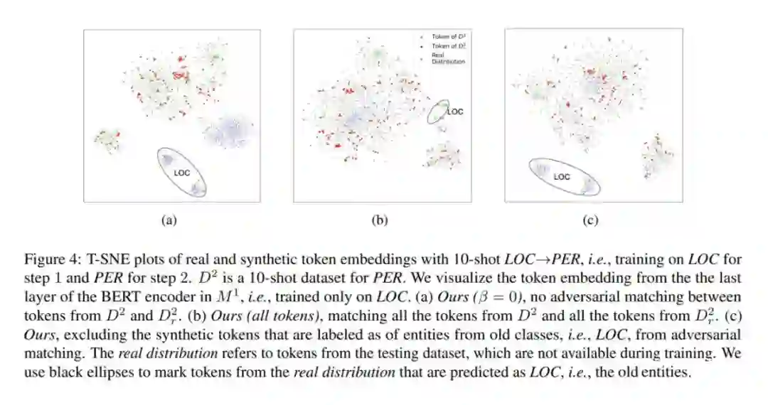 (b)中合成数据匹配真实数据分布,但是只有很少一部分合成数据与 LOC 标签的 token 相近,这是由于上文所说 D2 中并不存在 LOC 标签,将合成数据所有 token 与 D2 数据匹配会导致偏离 LOC 标签,丢失很多旧标签的信息。(c)中作者采用的方法合成数据中很多 token 与 LOC 接近,且其余 token 也与真实数据分布相匹配。