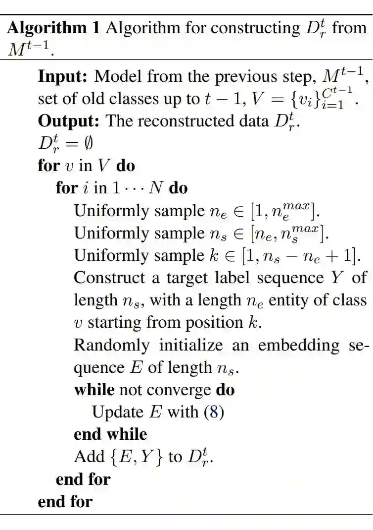 本文提出第一个类增量学习的少样本 NER 模型来解决灾难性遗忘。提出了使用上一时间步的模型来构建包含旧实体类的合成数据。合成数据提供了更加多样的包含新实体和旧实体的信息,使模型在少样本设置下不容易过拟合。本文也算是一篇启发性的论文,通过随机采样旧类实体标签序列以及只将“O”类与真实的新类数据以对抗的方式匹配,使合成数据更真实,且包含更多信息。