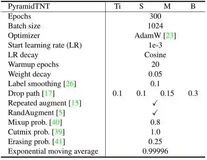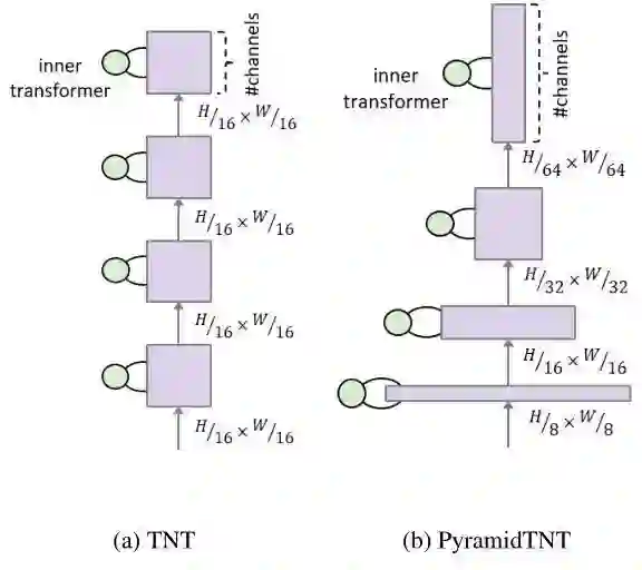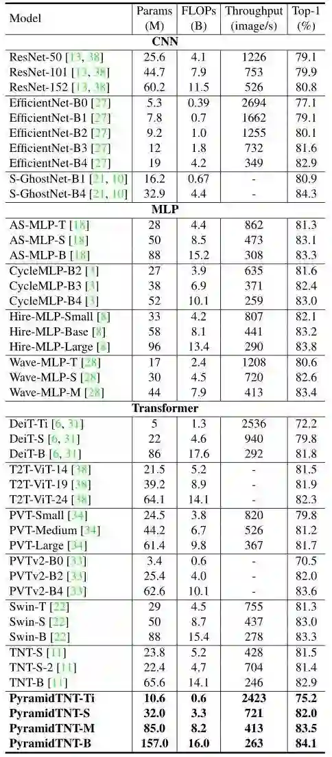 TNT 架构没有使用 PVT 提出的 Transformer 模型金字塔结构,而金字塔结构在大多数 Vision Transformer 和 MLP 模型上都被证明了有很好的建模性能,所以 Pyramid TNT 作为 TNT 的 Extended Version,进一步验证了金字塔结构对于 TNT Backbone 的作用。