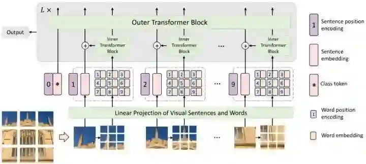 式中 是每个块的大小。ViT,DeiT,IPT,SETR,ViT-FRCNN 到这里就把它们输入 Transformer了,TNT 为了更好地学习图片中 global 和 local 信息的关系,还要再进行一步。在 TNT 中,作者将 patch 视为表示图像的视觉 "sentence"。每个 patch 进一步分成 个子块,即一个 "sentence" 由一系列视觉 "words" 组成。