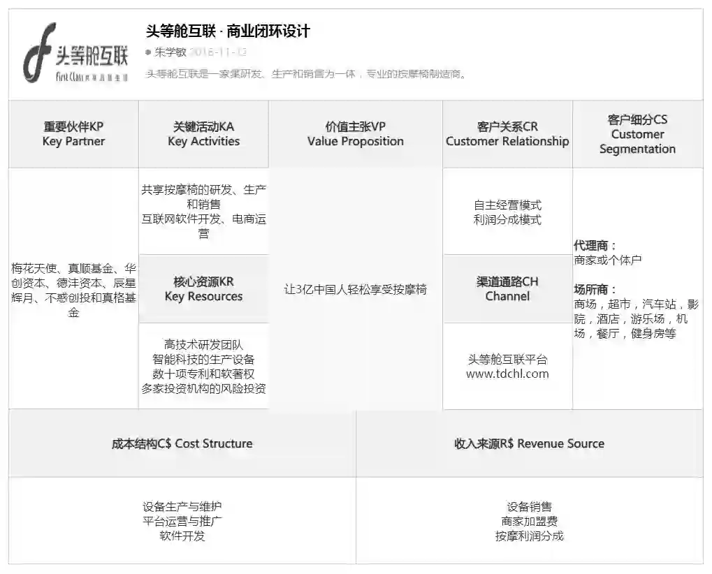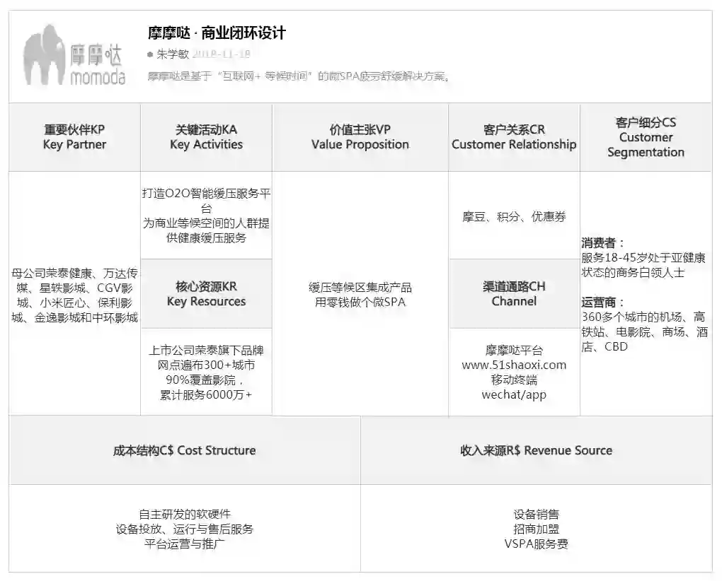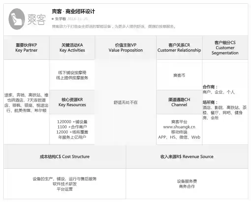 客户细分CS:消费者: 服务18-45岁处于亚健康状态的商务白领人士 运营商:360多个城市的机场、高铁站、电影院、商场、酒店、CBD;