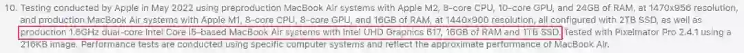 NBC 发现,苹果选取的是 2019 款 MacBook Air,CPU 为 14nm 的双核酷睿 i5-8210Y,基础频率只有 1.6GHz。GPU 则是英特尔 UHD Graphics 617。与这颗处理器相比,M2 采用的则是 5nm 制程工艺,具有 8 个 CPU 核心和多达 10 个 GPU 核心。