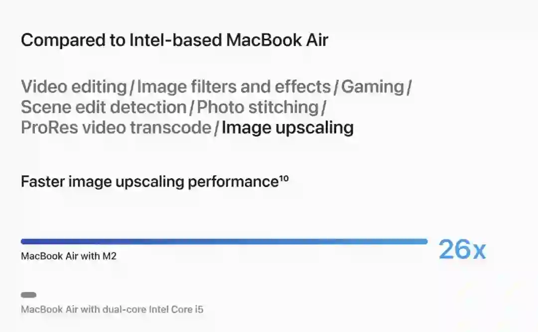不过,知名笔记本领域媒体 notebookcheck(NBC) 在 M2 与其他处理器的参数对比中发现了一些端倪。苹果宣称,在与搭载英特尔酷睿 i5 双核处理器的比较中,M2 处理器在视频剪辑方面快了 15 倍,在图像放大方面快了 26 倍。