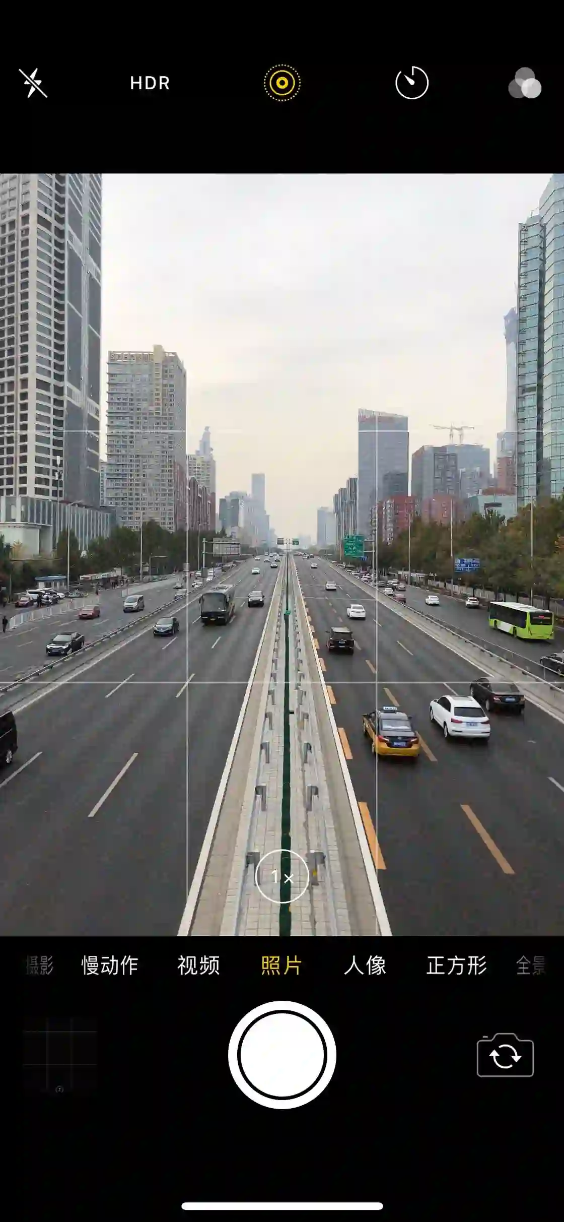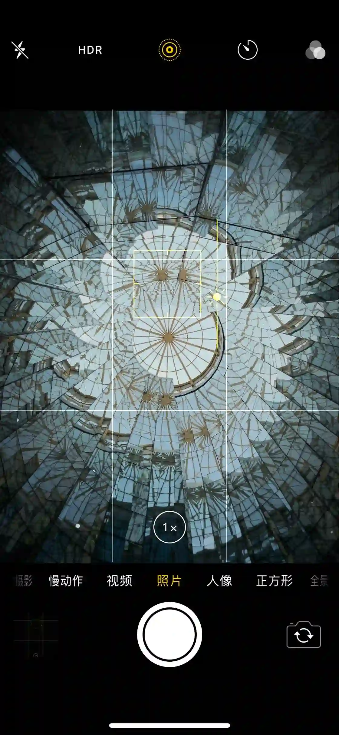 可以看出相机界面顶栏布局发生了改变,在关闭自动 HDR 功能后,Live Photo 选项位居顶栏中央。这在使用对称构图却没有中心线作为辅助线时可以作为很好的参考。如果使用的是配有双摄像头的 iPhone 那么可以以画面下方的边角标志和上方的 Live Photo 选项为中线参考进行构图。