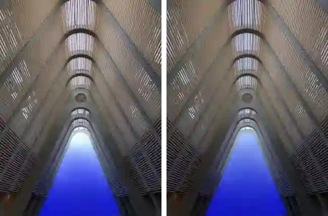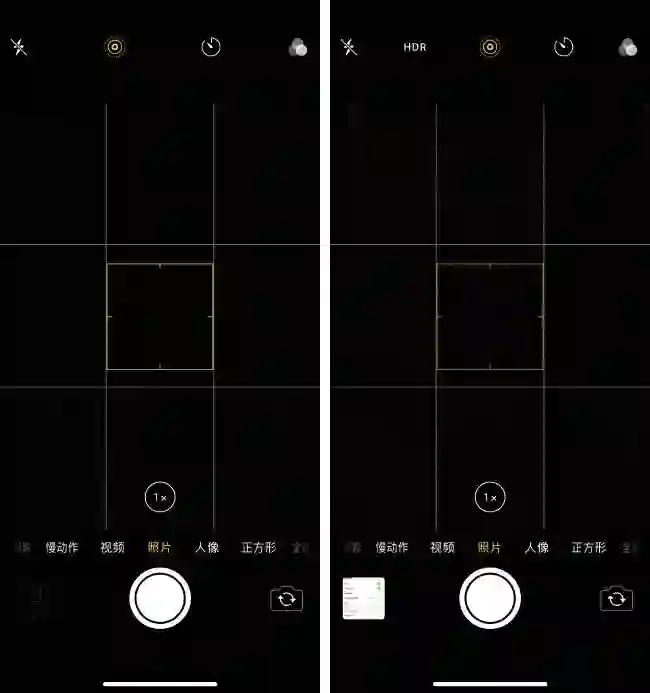 除此之外,选择关闭自动 HDR 还有一个重要的原因,就是它解决了我使用自带相机拍摄对称式构图时没有参考线的苦恼。首先给大家看一下自动 HDR 功能关闭前后自带相机界面的对比: