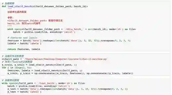 数据是被序列化以后存储的,因此我们需要使用Python中的pickle包将它们读进来。整个压缩包解压以后,会有5个data_batch和1个test_batch。我们首先把数据加载进来: