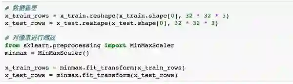 构造好了我们的x_train, y_train, x_test以及y_test以后,我们就可以开始建模过程。在将图片扔进模型之前,我们首先要对数据进行预处理,包括重塑和归一化两步,首先将32 x 32 x 3转化为一个3072维的向量,再对数据进行归一化,归一化的目的在于计算距离时保证各个维度的量纲一致。