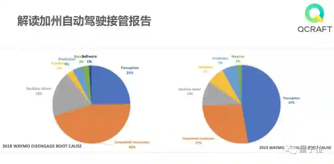 以总里程数和里程覆盖的多样性都比较受业内认可的Waymo为例,当比较Waymo在2018年和2019年的接管类型时,可以发现很有意思的一点:感知所占的比例明显变多了,从25%升到了47%。