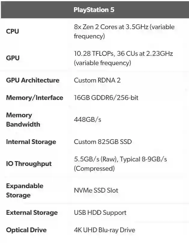 配置方面,PS5 搭载了 8 核 16 线程的 AMD Zen2 处理器,最高频率可达 3.5GHz ,GPU 频率为 2.23GHz ,达到了 10.3 TFLOPS 的性能。内存/显存总量为 16GB GDDR6 ,配以 825GB 的 SSD 固态硬盘,内置一个 NVMe 插槽,支持外接 HDD 。