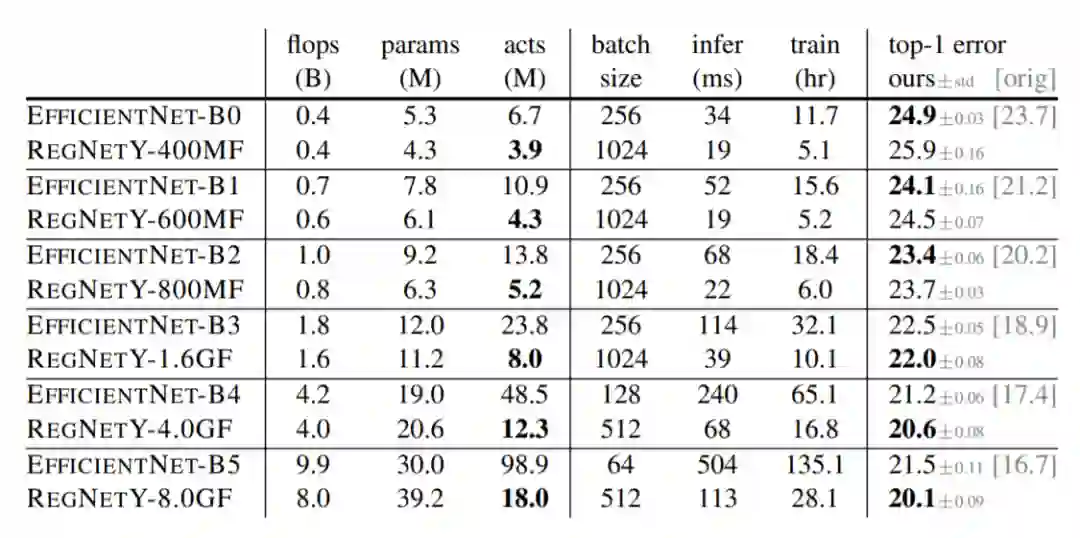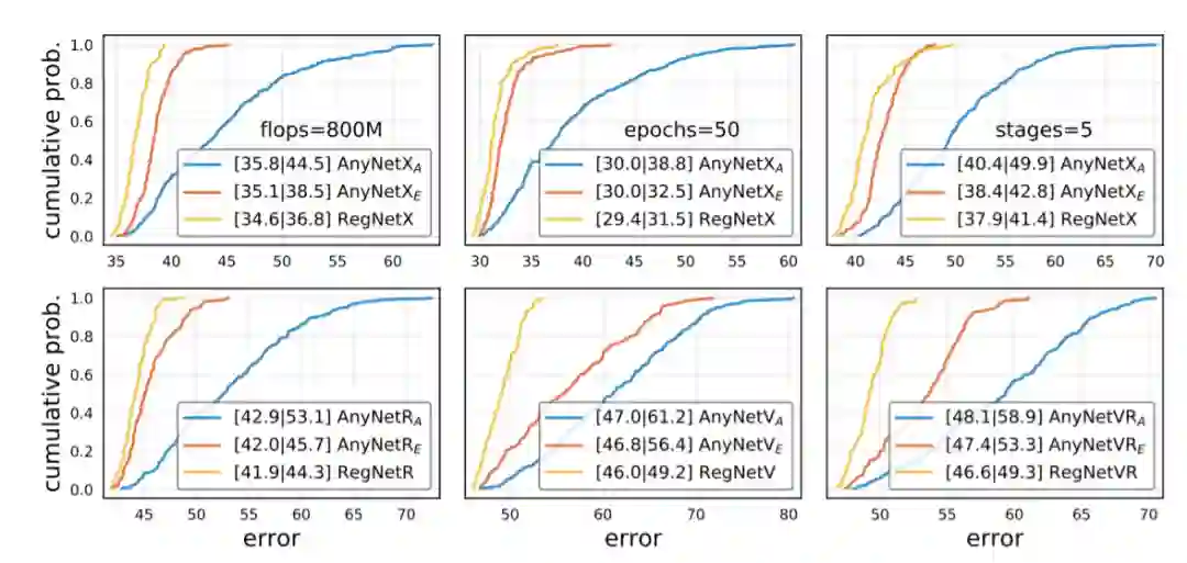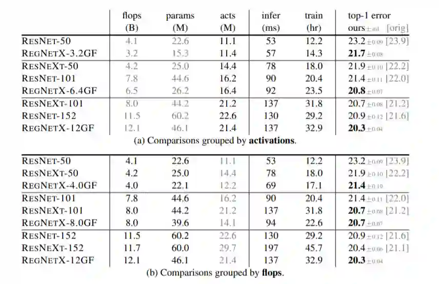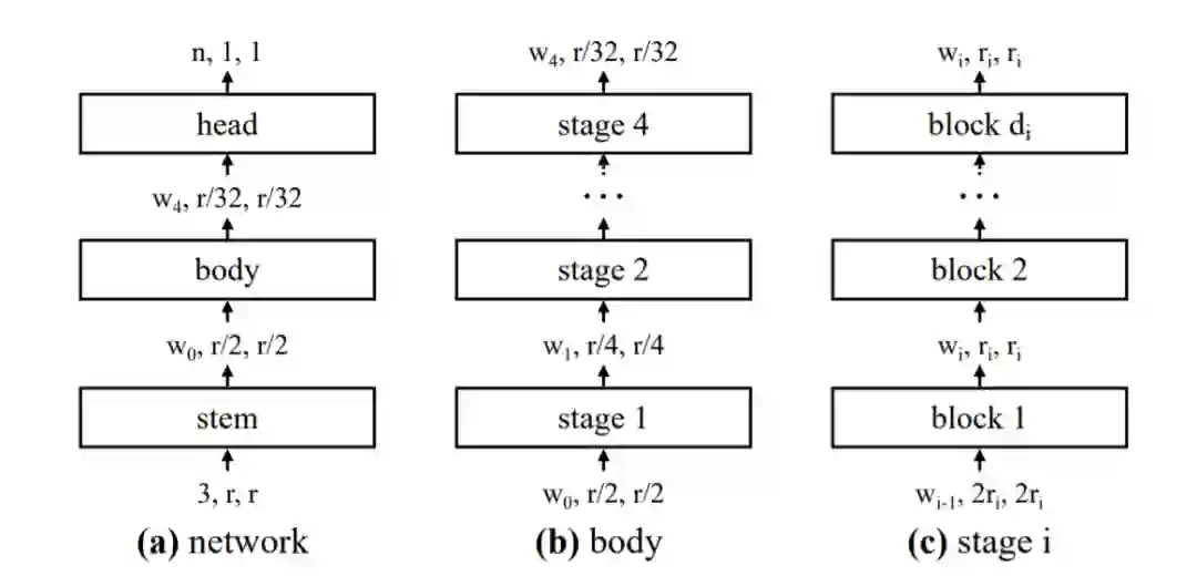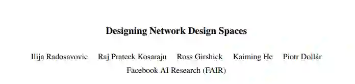 近日,何恺明大神组又发了一篇新论文,提出了一种新的网络设计范式。与以往研究不同,他们没有专注于设计单个网络实例,而是设计出了参数化网络群的网络设计空间。这种新的网络设计范式综合了手工设计网络和神经架构搜索(NAS)的优点。在类似的条件下,他们设计出的网络超越了当前表现最佳的 EfficientNet 模型,在 GPU 上实现了 5 倍的加速。目前,该论文已被 CVPR 2020 接收。