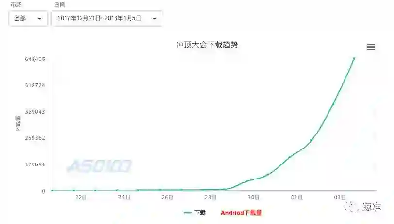 (1)从“冲顶大会”APP上线至今,不到半个月的时间里,已经在iOS和android端积累了超过100万的下载量——这大概是近2年来最快达到百万用户体量的APP了(见下图):