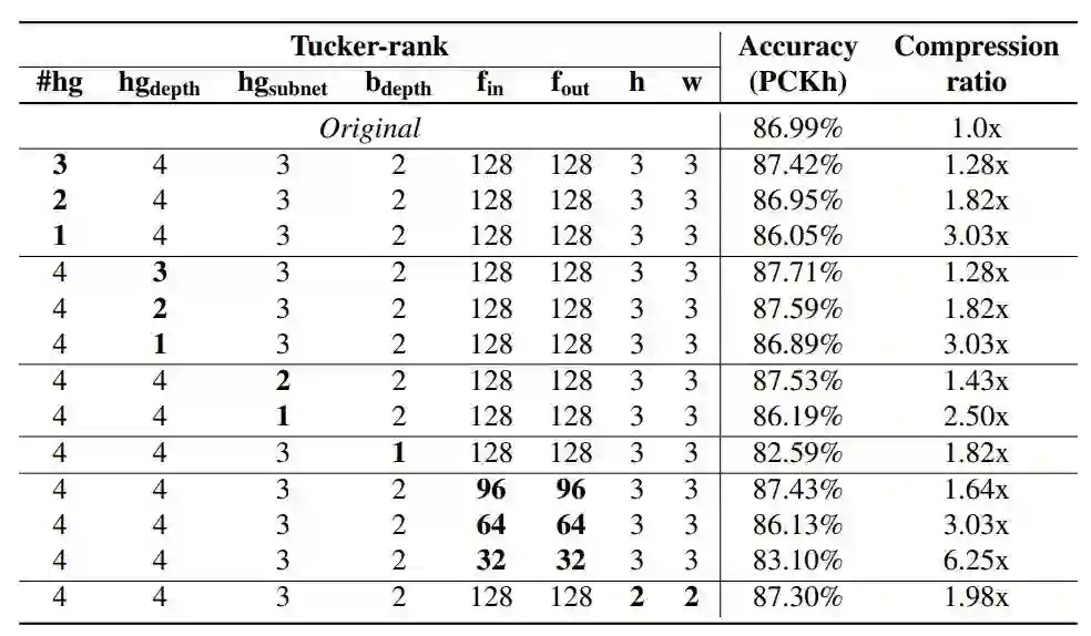 表2:人体姿势估计任务。每种模式下8阶权重张量的冗余性研究。研究人员通过降低每一维度在Tucker张量中的相应秩来对其进行压缩。报告的准确率以PCKh表示。