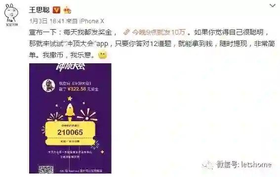 三十岁的王思聪生日当天连发两条微博,一条扯出一场全民吃瓜大戏,另一条“冲顶大会,我撒币,我乐意”则掀起了知识竞赛直播答题 APP 热潮。随后,“芝士超人”“百万英雄”“百万赢家”等同类应用紧随其后,刷爆朋友圈。