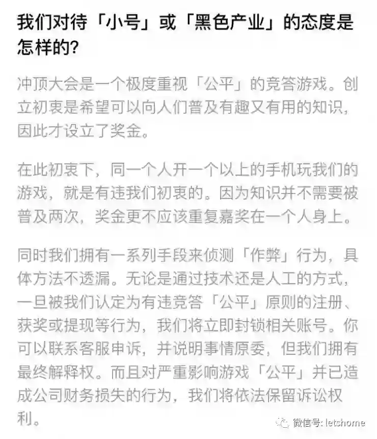 但“冲顶大会”的规则说明中针对“小号”或“黑色产业”明确表示,“无论是通过技术还是人工的方式,一旦被我们认定为有违竞答公平原则的注册、获奖或提现等行为,我们将立即封锁相关账号。你可以联系客服申诉,并说明事情原委,但我们拥有最终解释权。”