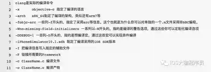 iPhoneSimulator10.1.sdk -fasm-blocks ... -I 上文提到的文件 -F 所需要的Framework-iquote 所需要的Framework ... -c ClassName.c -o ClassName.o