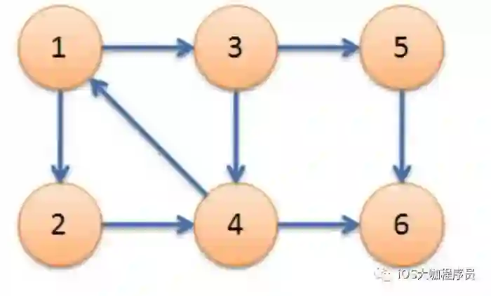 下图中,子图{1,2,3,4}为一个强连通分量,因为顶点1,2,3,4两两可达,{5},{6}也分别是两个强连通分量。