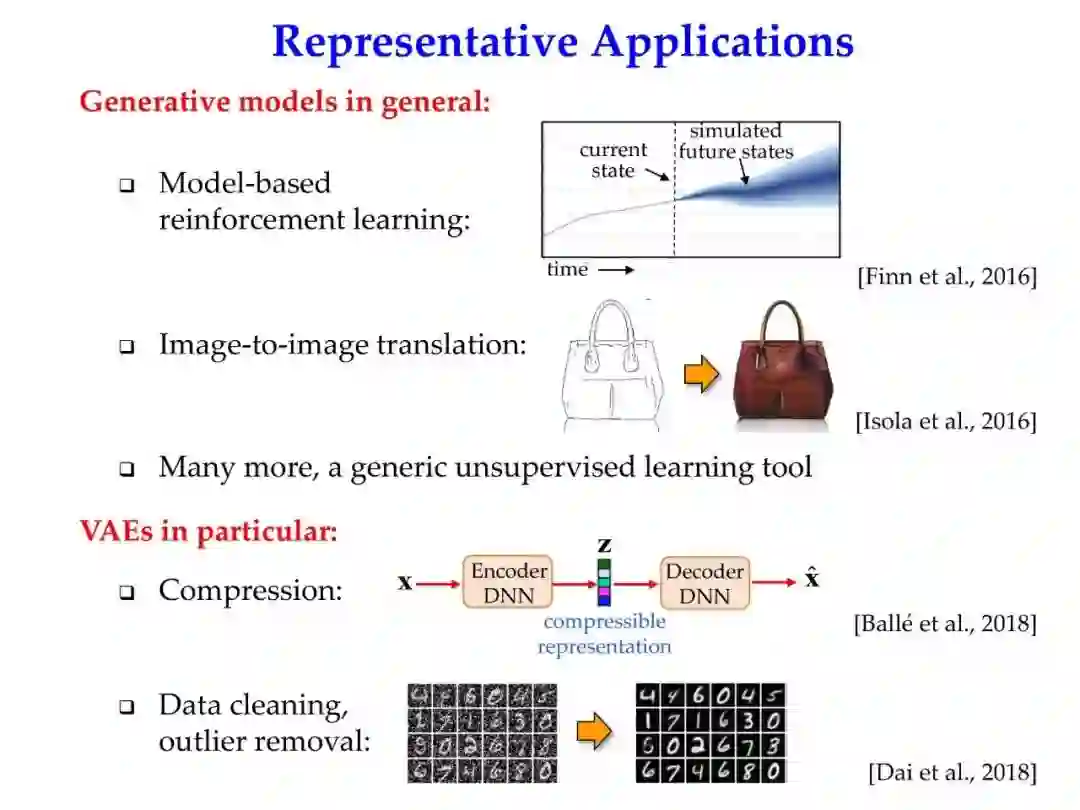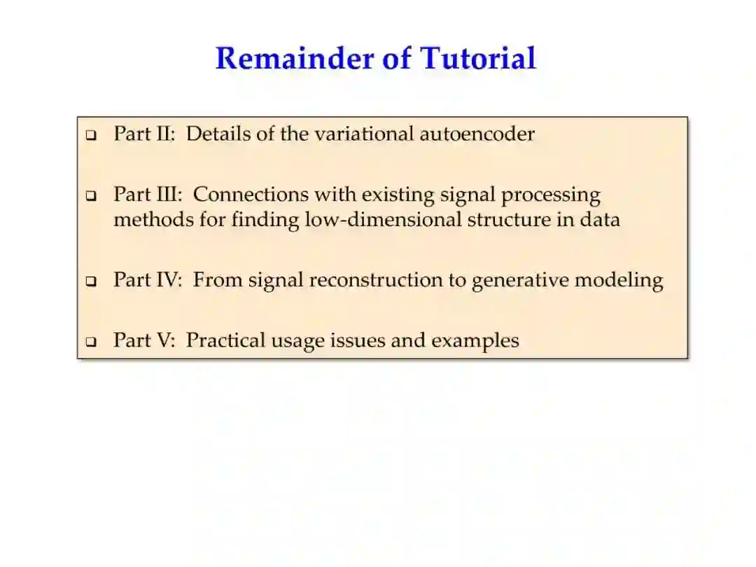 本教程将重点介绍深度生成模型的核心原则,包括理论和实践,在众多信号处理算法那与降维方法中,VAE框架受到了特别的关注。此外,在此背景下,VAEs将被解释为一种强大的非线性模型类,即能从噪声干扰的训练数据集中重建流形空间,又能隐式的学习样本在该流形中的分布信息。此功能与语音、图像处理、计算机视觉、半监督学习问题中,具有广泛的相关性。
