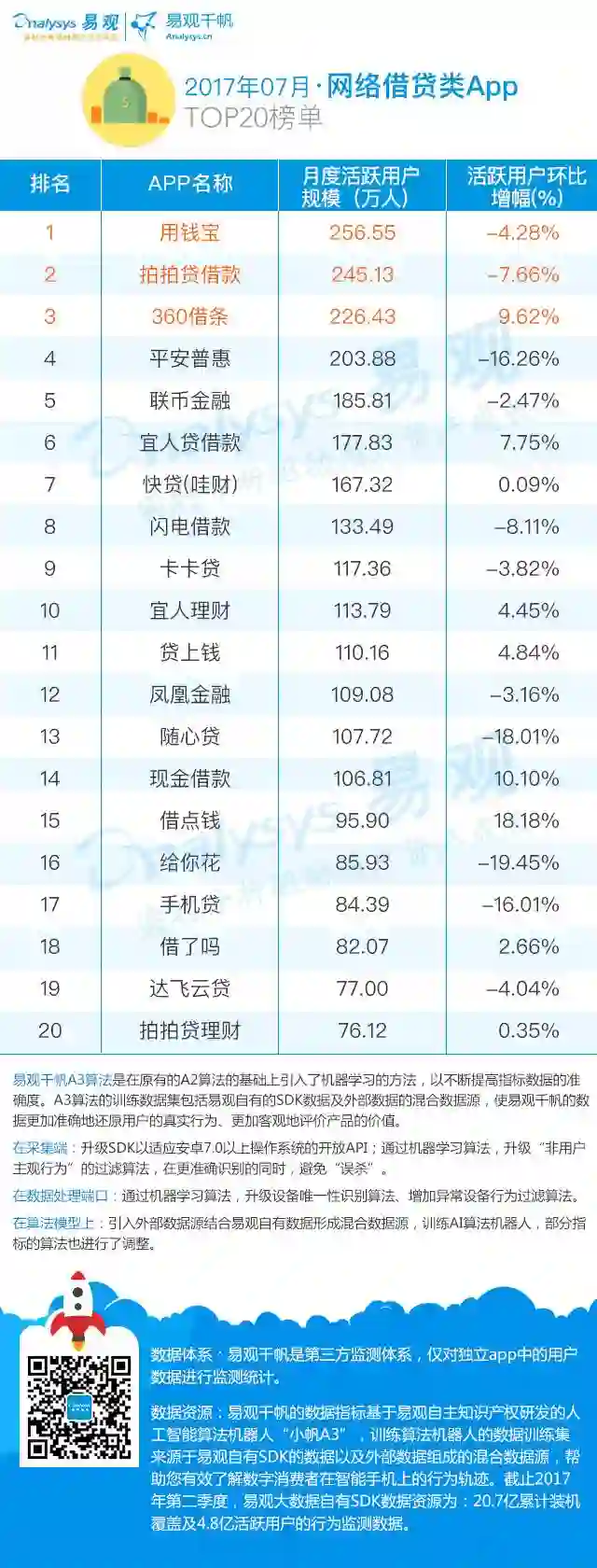 网络借贷经过2016年的互联网风险专项整治,2017Q1活跃用户规模大幅下滑。随着行业的逐步规范,2017年5月-7月活跃用户规模有所回升,7月的活跃用户规模回升到2000万以上,总体上网络借贷的活跃用户规模仍不大,并且分布相对分散,缺少具有垄断地位的应用。活跃用户规模超过200万的应用仅有用钱宝、拍拍贷借款、360借条、平安普惠四个应用,360借条活跃用户上升了9.62%。