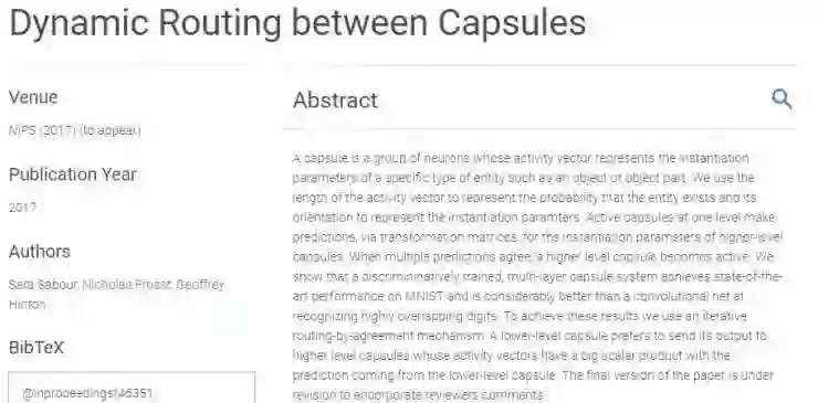 2017 年 10 月 26 日,Hinton 和 Sara Sabour 、 Nicholas Frosst 共同完成的论文《胶囊间动态路由》[6]( Dynamic Routing Between Capsules ),被 NIPS 2017 大会接受。这篇论文正式提出了胶囊( Capsules )的概念,这是一种神经网络的扭曲,旨在让机器通过图像或视频更好地了解世界。其目的在于弥补目前机器学习系统中限制有效性的缺陷。Google 和其他公司目前使用的图像识别软件都需大量的示例照片才能“习得”在各种情况下准确地识别对象的能力。造成这一状况是因为该软件不擅长将学到的东西在新的场景中泛化。比如,同一个物体从新视角观察也可以得出相同的结论。