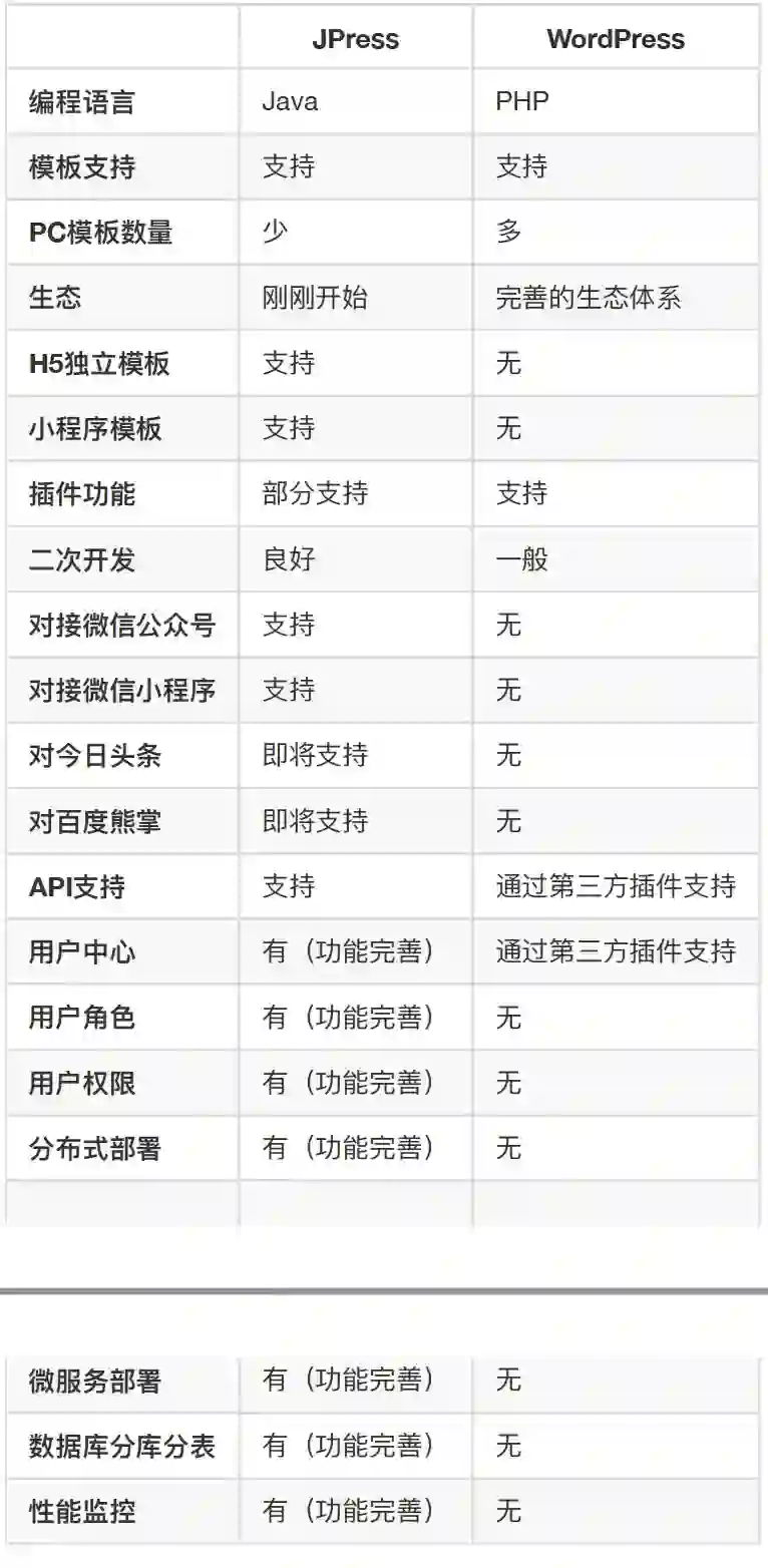 JPress 和 WordPress 的差别,其实还有更多的地方,以上表格做了部分对比。