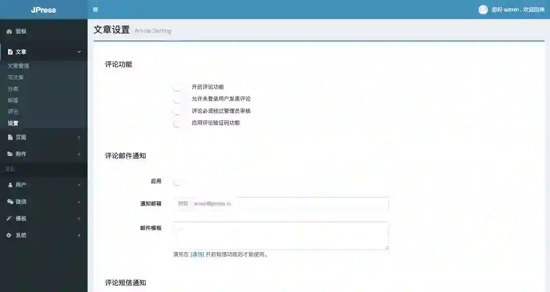 以后的只要我们在JPress发布文章、文章会寻找到自己类别的用户,通过不同的方式(邮件、短信和微信模板消息)去通知用户。
