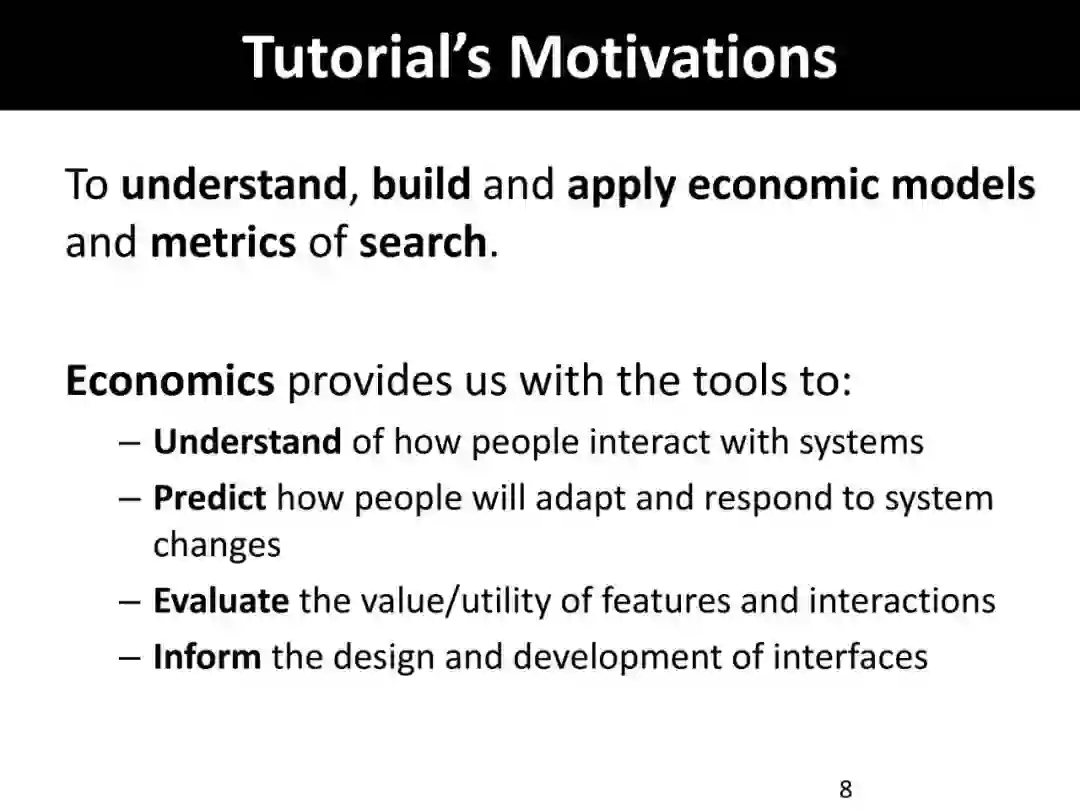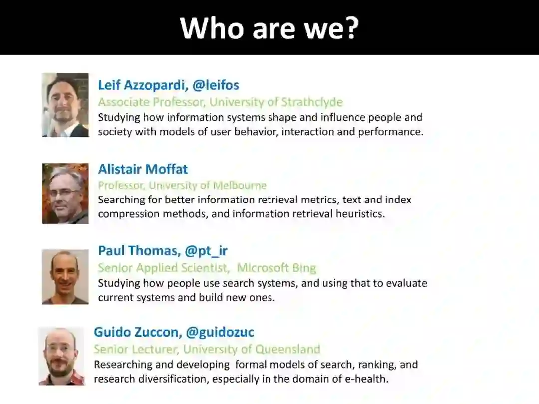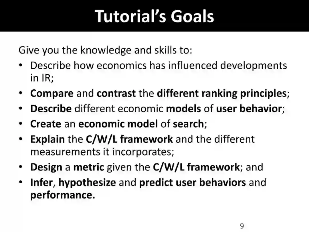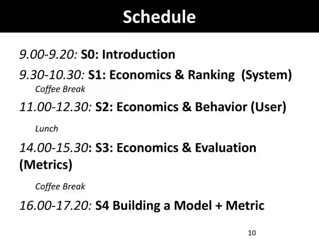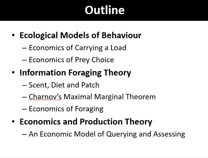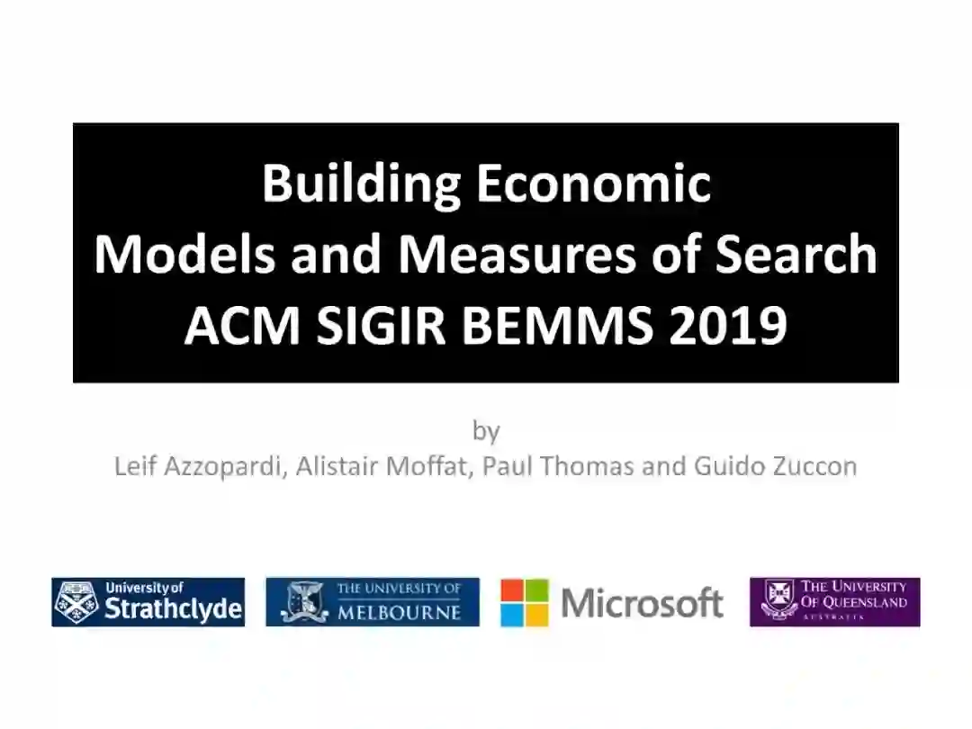 在本课程中,我们将首先概述相关的经济理论,例如信息觅食理论和搜索中的微观经济学。接下来将展示如何使用经济学模型来模拟用户与搜索系统的交互,以生成关于行为和性能的假设,这些假设可以为实验提供相关信息。第三部分,将重点介绍如何利用经济学,来为信息检索系统提供CWL框架支持。然后,将展示如何使用信息觅食理论,来衡量信息检索系统的性能 (将人们搜索的理论,与我们如何衡量它的理论联系起来)。