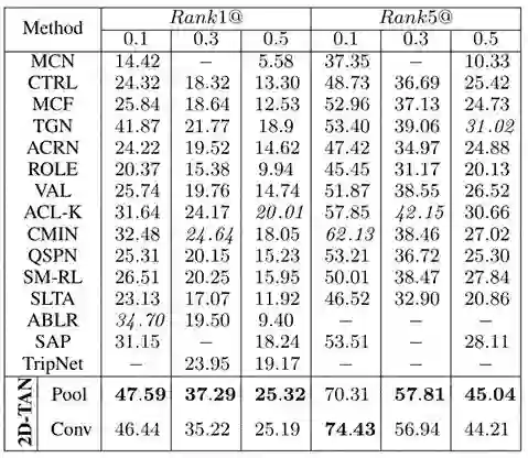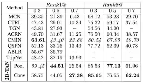 表1:Charades-STA 的实验结果。Pool 和 Conv 表示两种不同的片段特征提取方式,下表同。