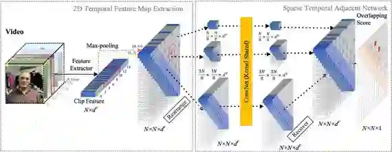 考虑到 2D-TAN 方法的通用性和其在基于自然语言的时间定位任务上的优异性能,我们在后续的工作中将其拓展到了视频内人体动作检测任务中。该任务需要在给定的长视频中,检测出视频中预定义的动作片段类别及其开始和结束时间点。一种通常的做法是将该任务拆分成两步,首先检测出哪些片段可能存在预定义动作的片段(proposal generation),然后预测这些候选片段可能所属的类别(classification)。考虑到这类做法的第一步和我们提出的 2D-TAN 方法很相关,本质上都是要解决片段之间的相互依赖关系的问题,因此我们用 2D-TAN 方法针对该任务进行了改进,如图5。