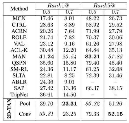 本文针对视频内容片段定位问题提出了一种二维时间图表示方式与一种新的时域邻近网络(2D-TAN),其有效性已在基于自然语言描述的视频内容定位和人体动作检测两个任务上得到了初步的验证。该方法目前仍处于一个初步探索的阶段:从网络结构的角度来说,当前的结构仅采用简单地堆叠卷积层的方式,相信进一步优化网络结构本身会带来性能上的提升。另一方面,从方法的通用性角度来说,目前我们仅验证了两个任务,仍有许多相关任务值得拓展,例如视频文本描述,视频内容问答,亦或是语音等其他包含时序信息的任务。