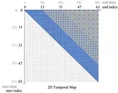 当 N 较大时,特征图的计算量也会随之增大,为解决此问题,我们还提出了一种稀疏图的构造策略,如图4所示。在该图中,我们根据片段的长短进行不同密度的采样。对于短片段,我们枚举出所有可能,进行密集采样。对于中等长度的片段,我们采样的步长设为2。对于长片段,我们采样的步长设为4。通过这种方式,我们可以降低因枚举所带来的计算开销,同时保证精度。所有未被选中的片段被填充为0,不参与后续的计算。