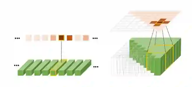相较于基于自然语言描述的视频片段定位,视频内动作定位的目标片段往往比较短。因此需要的采样频率更高,采样的单元片段个数 N 也因此更大。相应地,在特征图中长片段的采样步长也会比较大,底层的卷积层往往感受不到足够的上下文信息。在图5中,红色虚线方框表示的是中等长度片段在第一层涉及到的邻近片段,而黄色虚线方框表示的是短片段要涉及的邻近片段。我们可以看出,黄色框涉及的上下文信息要比红色框的多。因此我们在 2D-TAN 的基础上,针对长片段上下文信息较少,设计了一个稀疏二维时域邻近网络(Sparse 2D Temporal Adjacent Network, i.e. S-2D-TAN)。该网络将稀疏图按照采样的步长,拆分成三个更紧凑的时域特征图。通过将不同特征图分别通过一个共享内核的卷积网络,从而使得长片段可从周围的特征中获得更多的上下文信息。
