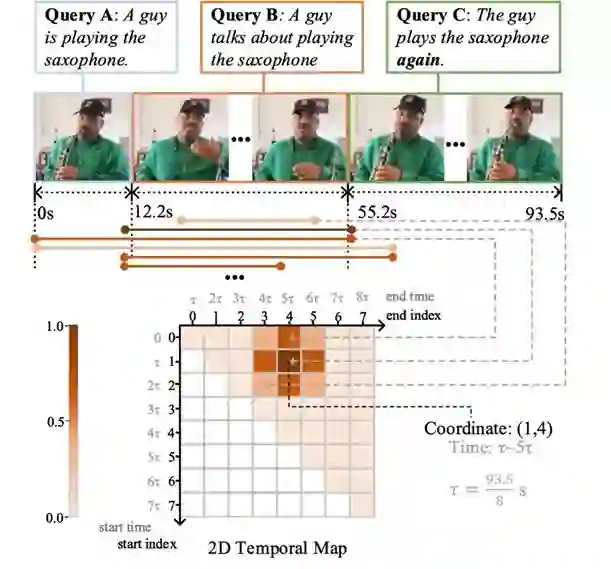 图1:任务示意图。在二维时间图中,黑色坐标轴上的数字表示开始和结束的序号,灰色坐标轴上的数字表示序号所对应的时间点。二维时间图中方格的红色程度反映该片段与目标片段的重叠程度,取决于视频长度及采样比例。