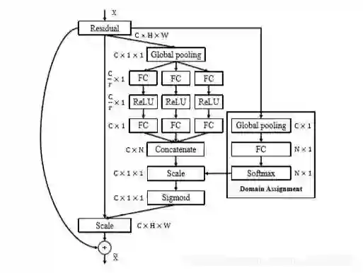 由上图可以看到,该模型就是将多个SENet得到的结果连接到一起,同时提出一个Domain Assignment结构,该结构也基本上是借鉴SENet的,用于在检测场景上施加Attention操作,最后得到一个综合了通道attention和domain attention的CX1X1的结构,该结构最后和原特征图做channel-wise multiplication。过程比较简单,论文里的公式都不想写过来了。