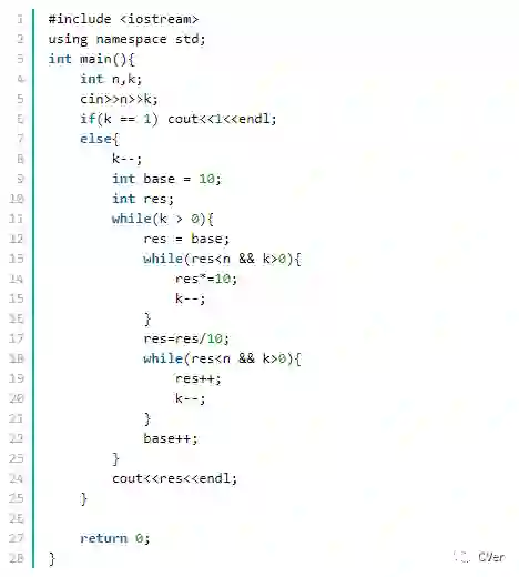 Q:我们输入两个值n和k,n表示我们有从1到n个整数,然后将这些整数都字符串化之后按字典排序,找出其中第K大的。例如:n=15,k=5.那么1-15字符串化之后排序如下:1,10,11,12,13,14,15,2,3,4,5,6,7,8,9。其中第5大的就为13。