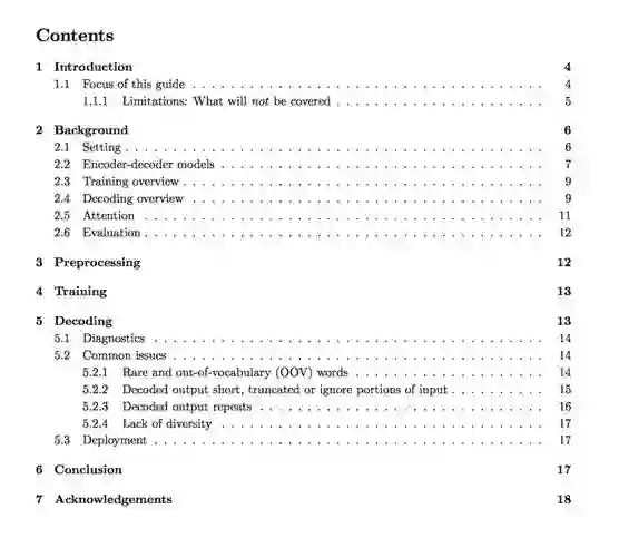 本指南着重于对文本生成任务中神经编码器和解码器模型(带有注意机制)的训练和解码过程给出意见。大致来说,源和目标被假定为几十个符号序列。本指南的重点是解码过程。除了提出改进模型训练和解码算法的建议外,我们还简单地介绍了预处理(第3节)和部署(第5.3节)。