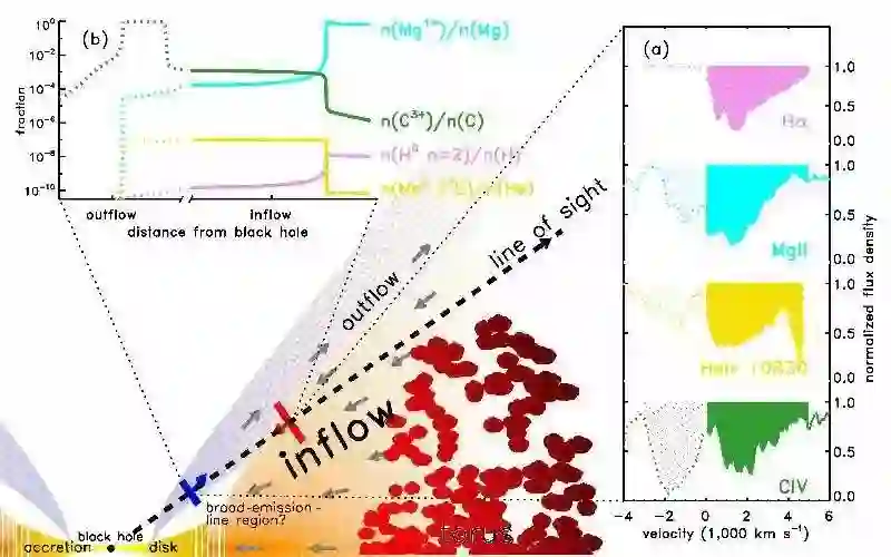 类星体吸收线技术是探测类星体附近、位于地球和类星体连线上的气体的强有力工具。研究组创新性地使用了激发态的中性氢和氦元素所产生的吸收线作为内流气体的探针。这一探针的优势是:理论上最内区的内流气体密度较高且温度较低,更容易产生激发态的中性氢和氦的吸收线。研究组使用这一探针在8个类星体的寄主星系中探测到了内流。内流在观测上表现为由于多普勒效应而红移的吸收线,红移速度即内流速度最高可以达到5000千米每秒,并且在0到最高速度之间连续,表现出了气体在黑洞引力作用下持续加速下落的过程。利用辐射转移、热力学等模拟内流气体的吸收线光谱并和观测数据对比可以推算内流气体的密度、位置、厚度等物理参数,这些参数符合黑洞吸积模型的预期,更重要的是对位置的计算结果直接验证了内流确实位于吸积盘附近,处于最内区。