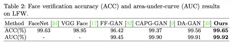 为了展示本文方法在受限场景和非受限场景中都可以得到很好的效果,作者在LFW数据集上计算了ACC和AUC指标,都达到了SOTA效果。