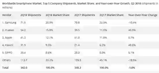 2018年第二季度智能手机出货量(图据IDC)