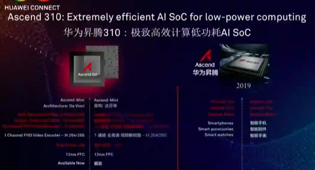 两颗AI芯片:华为自研的云端AI芯片昇腾系列,基于达芬奇架构的华为昇腾910和华为昇腾310,以及基于这两款芯片的云服务;