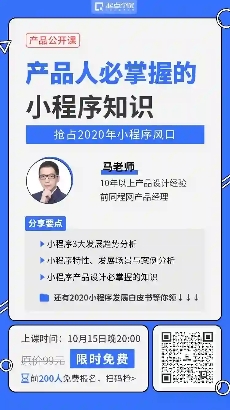 基于此,起点学院特邀业内10年资深产品老司机@马老师联合打造“小程序公开课”,带你了解行业发展趋势,掌握小程序产品设计前必须学习的知识点,抓住行业风口红利。